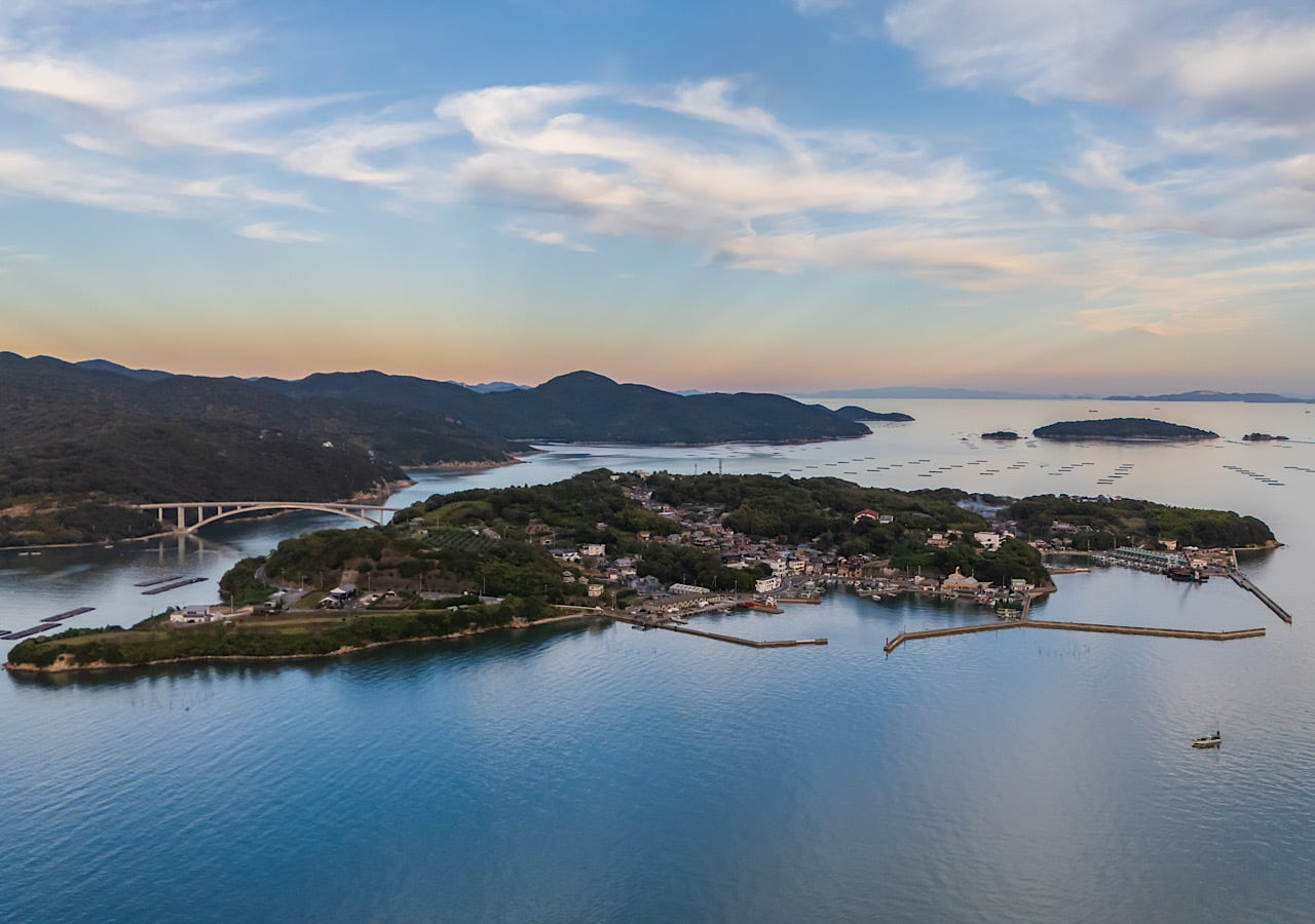瀬戸内国立公園の中に位置する日生諸島は、穏やかな気候と豊かな海に恵まれた、大小13の島々からなる美しい地域です。その中でも頭島は周囲約4kmの小さな島ながら、かつては牡蠣養殖やみかん栽培が盛んで、多くの民宿やペンションが立ち並び、観光と暮らしが共に活気づくにぎやかな場所でした。